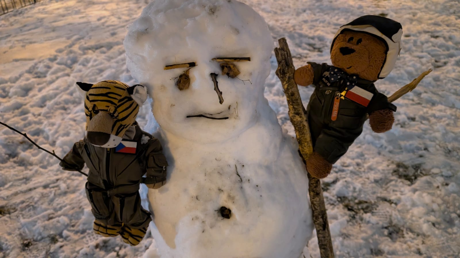 Když se nedá lítat, tak si aspoň postavíme sňuheláka jako leteckou hlídku. Takový sněhový řízení leteckýho provozu. Do ruky klacek jako anténu, pořádný kukadla, aby viděl, co se ve vzduchu děje...